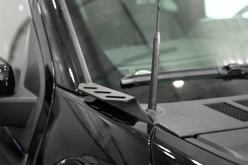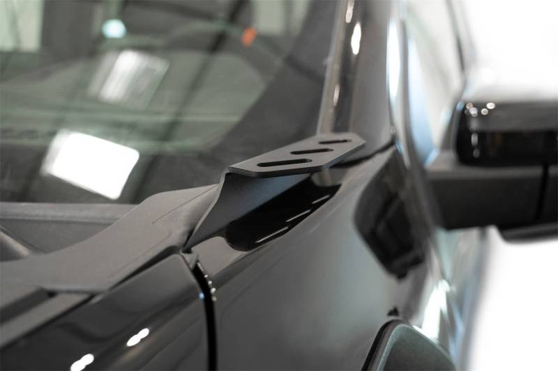 Illuminate your off-road adventures with our Ditch Light Brackets. Manufactured from 1/8-inch American steel and coated in a durable 2-stage black powder finish, these light mounts match your truck's styling. The light brackets are designed to mount to the hood hinges, positioning cube or round lights near the A-pillar. They are compatible with a variety of 3-6 inch LED lights from quality brands like Rigid and Baja Designs. Lights can be angled forward to light your path ahead, or towards the sides to enhance visibility around corners and obstacles. Integrated wire channels keep wiring neatly tucked out of view for a clean install. And as always, these are fully bolt-on and Made in America. * Please Note: Some light configurations may require wiper blade arm adjustment.