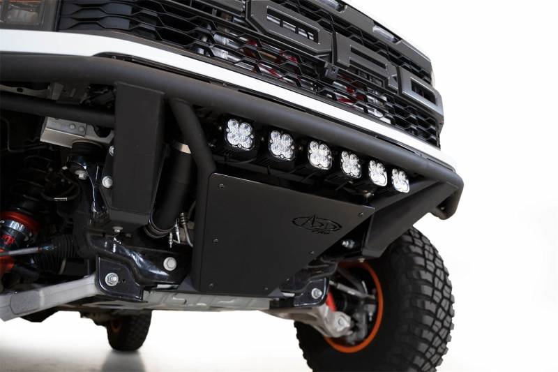 Our ADD Pro Frame Cut Raptor Front Bumper maximizes your approach angle, and does it with a clean and refined style. It closely follows the body contours of the front end of your Raptor. Utilizing .120 in. wall steel tubing thats finished in a hammer black powder coat its low-profile fitment enables you to hit those desert whoops with virtually no worries about your ground clearance. A satin black aluminum skid plate helps protect the undercarriage when approaching steep hills or dunes. At the center of the bumper a 20-inch radius LED light bar can be mounted for the sake of nighttime adventures. Alternatively up to 6 cube lights can be mounted in place of the light bar. The light mount sits protected underneath the tube steel and above the skid plate. As always this bumper is made in America.