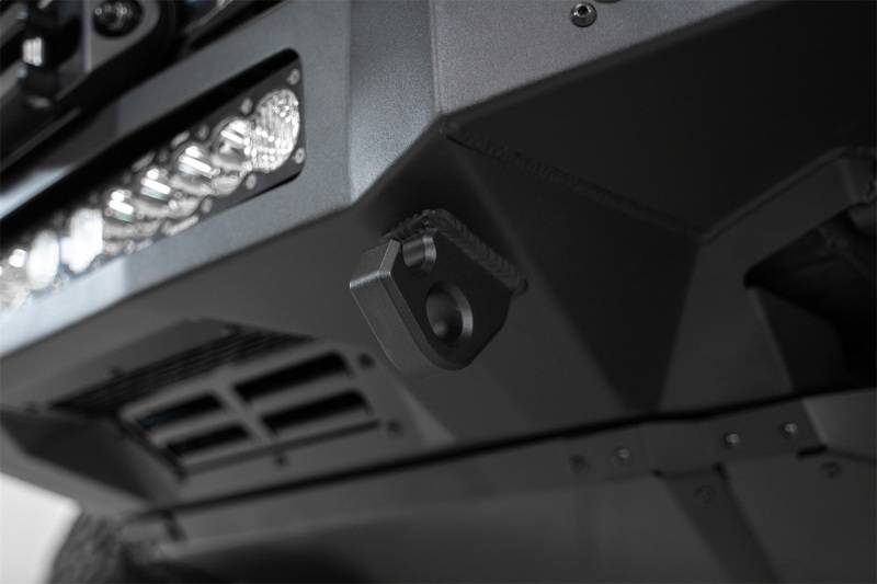 Transform the front of your Jeep with the Addictive Desert Designs Rock Fighter front bumper. The Rock Fighter is a stubby width bumper, meaning it will look good with any aftermarket fender you want to put on your JL. The patented universal light mount system in the center of the bumper allows you to mount any brand/size of light up to a 20 in. RDS or 5 cube lights. There are two additional cube light mounts on each top corner of the bumper. The two clevis mounts on the front of the bumper accept a 3/4 in. D-Ring and are reinforced to help out in tough situations. The Rock Fighter provides a greater approach angle to maximize offroad performance and two different top hoop options for even more front-end protection. This bumper is available with a low profile top hoop or a stinger. The main bumper structure comes in hammer black powder coat with satin black panels. This product is fully bolt-on and made in America.
