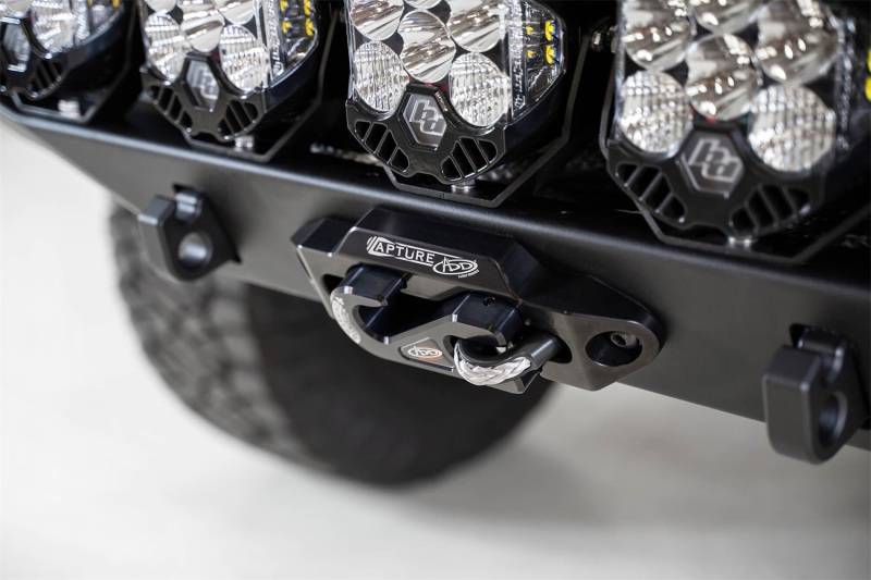 Winch mount; Sensor cutouts; Hammer black powder coat finish; Satin black powder coat panel finish; Mounts for dual light bars or round lights; Mounts for cube lights on sides;
