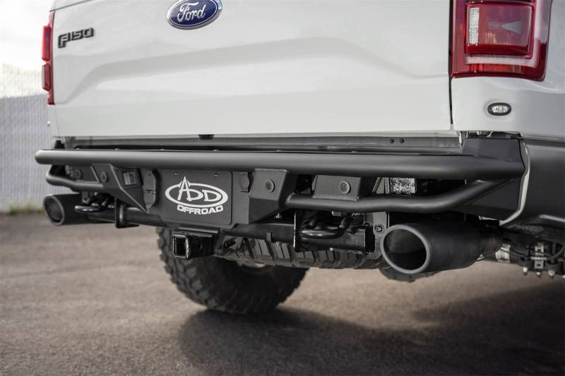 Complimenting the styling and aesthetics of the ADD PRO front bumper, the Ford Raptor ADD PRO Bolt-On rear bumper matches the slim look the PRO offers for the rear of your truck. Built with .120 in. wall steel tubing for strength and durability and an aluminum top plate for style. The ADD PRO Bolt-On rear bumper retains the OEM hitch functionality and includes mounts for two rear facing cube lights for additional lighting.
