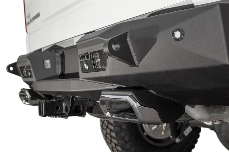 Backup sensor cutouts; Exhaust tips; Hammer black powder coat finish; Satin black powder coat panel finish; Mounts for cube lights;