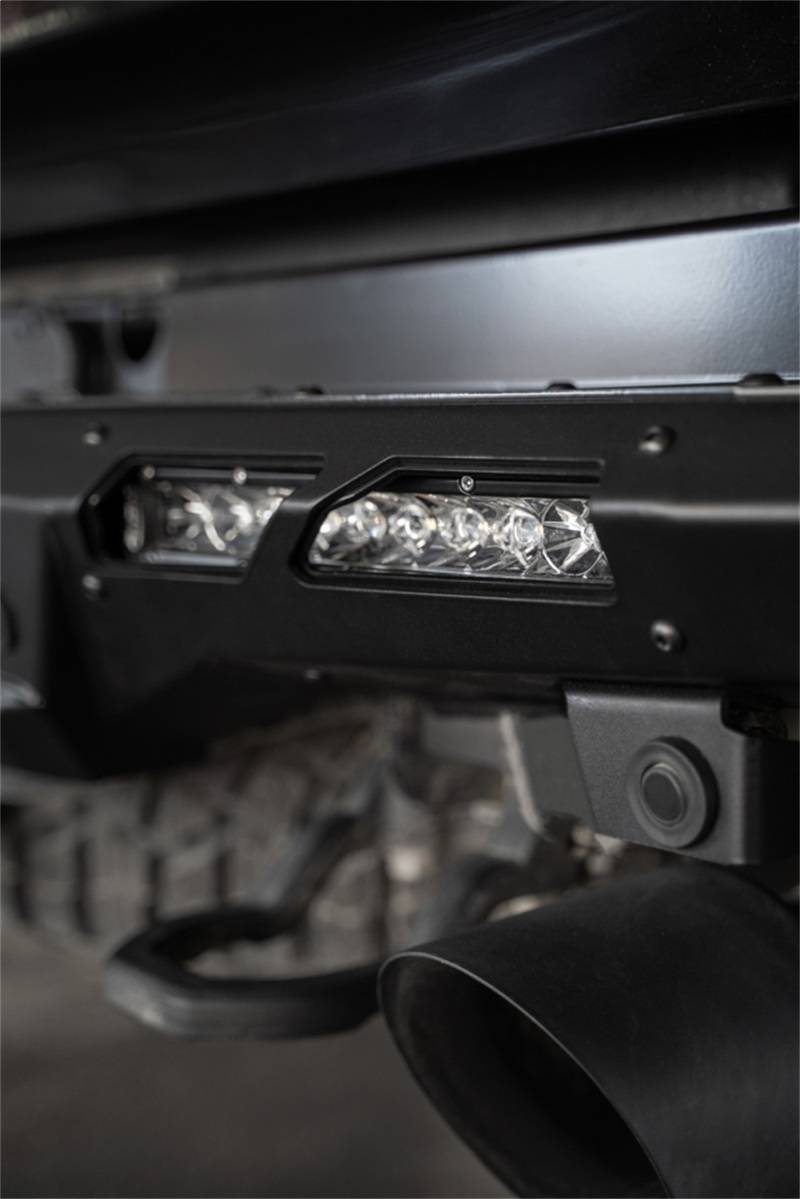 Made with plate steel and constructed in a modern box design, the Phantom TRX Rear Bumper provides superior protection over the factory option. It's designed to flow with the truck's rear body style, and its wings flare out in a unique hammerhead style. The factory dual exhaust and tow hooks fit comfortably below the bumper, and sensor cutouts retain full functionality of the parking/backup warning system. Towards each end of the bumper are mounting points for a pair of 10-inch SR LED light bars set behind satin black aluminum accent panels. As always, this bumper is fully bolt-on and Made in the USA