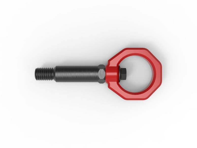 Add aggressive styling, and useful functionality to your BMW with aFe Control’s front tow hook. It’s sleek design not only looks great but is strong enough to safely winch your car onto a tow truck or get towed trackside if the need arises. Our BMW specific CNC machined stem and loop is made of 4130 steel. The stem is black zinc coated for corrosion resistance. The loop is powder coated Red (Blue, Black, and Gray are available). This is not a universal tow hook. The stem was specifically designed for the BMW and the length was carefully determined to fit the front bumper. A proper rear tow hook to match is also available. (p/n 450-502002-R) Both the stem and bolt threads are pre-coated with Vibra-tite threadlocker. This keeps your tow hook from loosening due to vibration. The special threadlocker is designed to remain flexible, removable, and reusable.