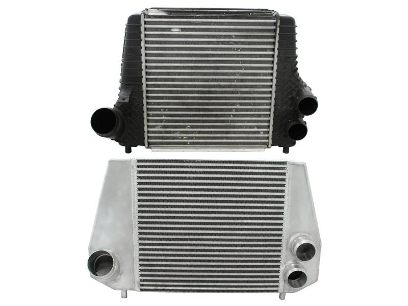 Bladerunner Intercoolers represent the next generation of intercoolers. The Bladerunner intercoolers utilize a 3 in. bar and plate design that out performs OE style tube and fin core designs. The end tanks are constructed out of 3/16 in. TIG welded aluminum plate tanks that incorporate three multi-directional vanes that efficiently direct air flow through the entire core for maximum cooling. The Bladerunner intercooler also comes with 4 1/8 in. pre-tapped ports for easy gauge installation as well as other auxiliary input options. Tested at 200psi which is perfect for the high boost applications. In recent testing the Bladerunner intercooler produced a 200 deg. temperature drop and a 100 deg. EGT drop as well as increasing air flow by 30 percent. Dont waste your time and money on modified factory intercooler. Invest in the aFe Bladerunner intercooler. the most sophisticated intercooler design on the planet.