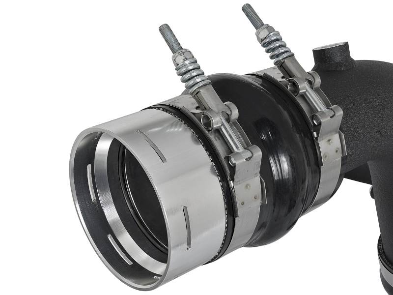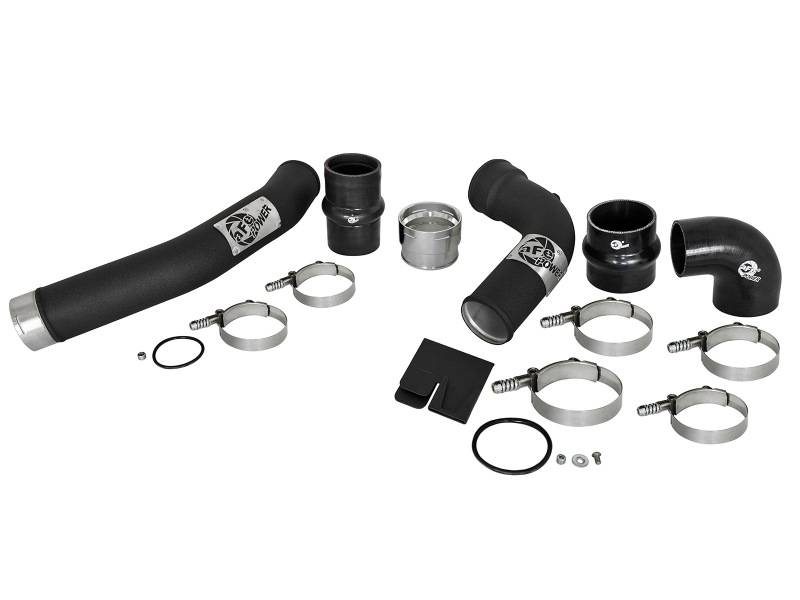 Flow and Performance: Constructed of mandrel bent, powder-coated aluminum tubing for maximum flow. The smooth transition bends decrease turbulence and minimize pressure loss, increasing horsepower, torque and lowering EGT's. Perfect Fit: Utilizes the factory mounting locations to provide stability for a hassle-free installation. Includes high quality stainless steel spring loaded t-bolt clamps and heavy-duty 5-Ply couplings for strength. This intercooler tube kit comes with two billet aluminum factory style quick-connect adapters that interface with the factory turbo and engine inlet to ensure a perfect seal. aFe Badging: A unique aluminum laser-cut aFe power logo plate is welded-on for an aggressive style.