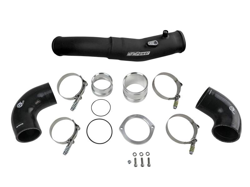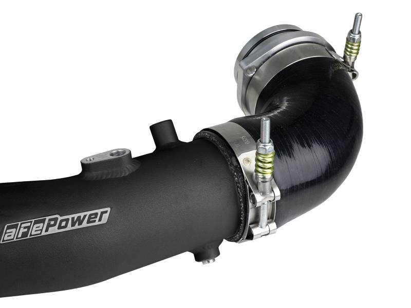 Smooth transitions in the mandrel-bent aluminum tubing decrease turbulence and minimize pressure loss, increasing horsepower and torque. This tube kit includes high-quality, stainless-steel, spring-loaded T-bolt clamps and heavy-duty, 5-ply, polyester reinforced silicone couplings. This intercooler tube kit features a factory style billet aluminum quick-connect adapter with an O-ring seal to ensure a leak-free fit while maintaining superior strength and durability. Finished in Wrinkle Black powder coating with a unique laser-etched aFe power logo for a custom look.