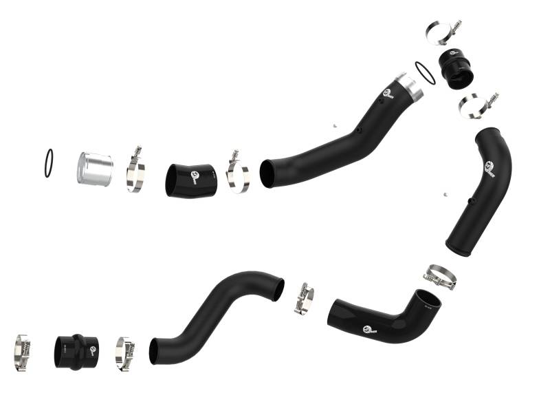 Smooth transitions in the mandrel-bent aluminum tubing decrease turbulence and minimize pressure loss, increasing horsepower and torque. The BladeRunner charge pipe kit provides a smooth transition between the turbo and the engine for lower operating temperatures and increased power. This charge pipe kit includes high-quality, stainless-steel, spring-loaded T-bolt clamps and heavy-duty, 5-ply, polyester reinforced silicone couplings. This pipe kit features factory style billet aluminum quick-connect adaptors with o-ring seals to ensure a leak-free fit while maintaining superior strength and durability. Finished in wrinkle black powder coating with a unique laser-etched aFe power logo for a custom look.