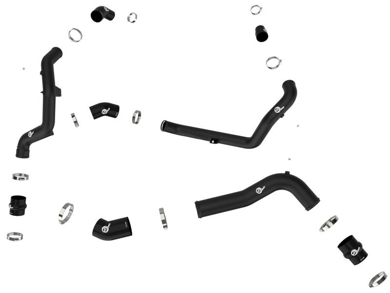 Smooth transitions in the mandrel-bent aluminum pipes decrease turbulence and minimize pressure loss, increasing horsepower and torque. This charge pipe kit provides a smooth transition between the turbo and the engine for lower operating temperatures and increased power. This kit includes high-quality, stainless-steel, SmartSeal clamps and heavy-duty, 5-ply, polyester reinforced silicone couplings for superior strength and durabilityFinished in wrinkle black powder coating with a unique laser-etched aFe POWER logo for a custom look.