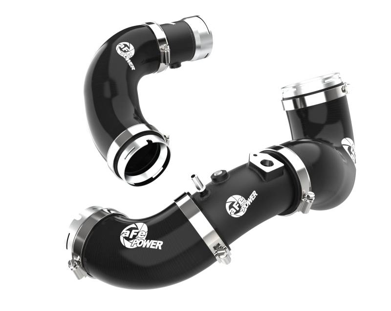 Smooth transitions in the mandrel-bent aluminum pipes decrease turbulence and minimize pressure loss, increasing horsepower and torque. This charge pipe kit provides a smooth transition between the turbo and the engine for lower operating temperatures and increased power. This kit includes high-quality, stainless-steel, smartseal clamps and heavy-duty, 5-ply, polyester reinforced silicone couplings. This charge pipe kit also features factory style billet aluminum quick-connect adapters with o-ring seals to ensure a leak-free fit while maintaining superior strength and durability. Finished in wrinkle black powder coating with a unique laser-etched aFe POWER logo for a custom look.