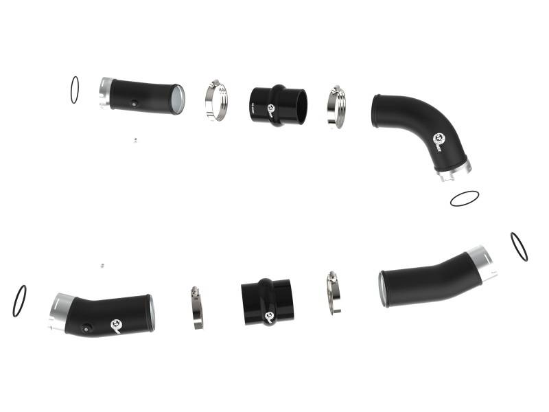 Smooth transitions in the mandrel-bent aluminum pipes decrease turbulence and minimize pressure loss, increasing horsepower and torque. This charge pipe kit provides a smooth transition between the turbo and the engine for lower operating temperatures and increased power. This kit includes high-quality, stainless-steel, SmartSeal clamps and heavy-duty, 5-ply, polyester reinforced silicone couplings. This charge pipe kit also features factory style billet aluminum quick-connect adapters with o-ring seals to ensure a leak-free fit while maintaining superior strength and durability. Finished in wrinkle black powder coating with a unique laser-etched aFe POWER logo for a custom look.