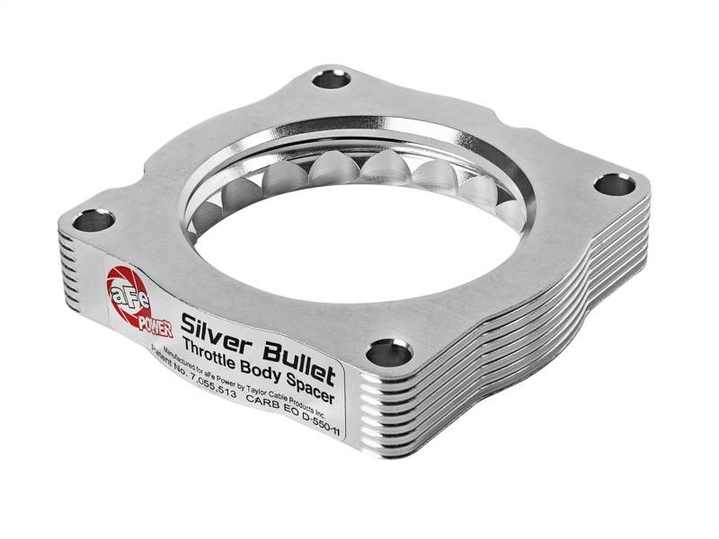 Silver Bullet throttle body spacers create turbulence in the air flow at the point just prior entry into the engine increasing horsepower, torque and improving throttle response and fuel efficiency. Silver Bullet throttle body spacers are constructed out of durable T-6061 billet aluminum and using a unique serrated/helix entry to create turbulence at the manifold while eliminating the annoying whistle found in other helix only throttle spacers.