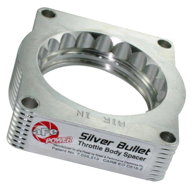 Silver Bullet throttle body spacers create turbulence in the air flow at the point just prior entry into the engine increasing horsepower, torque and improving throttle response and fuel efficiency. Silver Bullet throttle body spacers are constructed out of durable T-6061 billet aluminum and using a unique serrated/helix entry to create turbulence at the manifold while eliminating the annoying whistle found in other helix only throttle spacers.