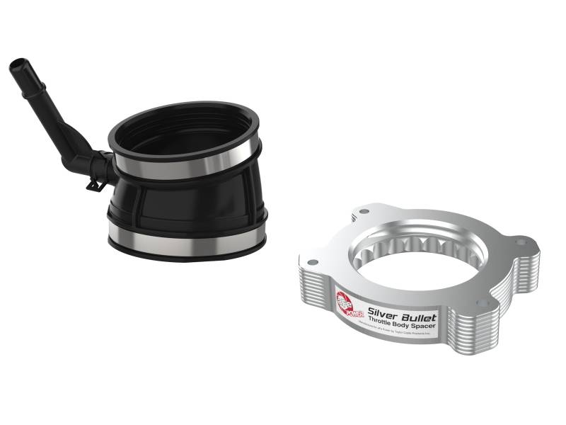 The serrated/helix design creates air turbulence in the intake manifold. This turbulence increases the air pressure in the combustion chamber, resulting in increased performance and improved throttle response. The serrated/helix combination design also reduces intake whistle that occurs with helix-only designs (US PAT 07055513). This Silver Bullet throttle body spacer is precision machined from 6061-T6 billet aluminum for lightweight, high strength, and perfect fit and finish. This Silver Bullet throttle body spacer uses all factory mounting locations, making for a hassle-free installation. A supplied gasket provides a perfect seal. This kit also includes a silicone coupling to guarantee perfect fitment and air flow with the factory air intake system. This item will NOT fit with aFe POWER air intake systems P/N: 57-10013D, 57-10013R, 58-10007D and 58-10007R. See 46-34023B for throttle body spacer with aFe POWER air Intake Systems.