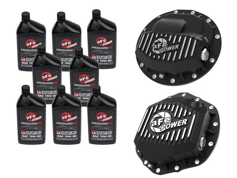 aFe Power’s Pro Series front and rear differential covers bring performance-driven protection to your drivetrain. Constructed from durable cast aluminum and designed with reinforced ribs, these covers offer enhanced strength and improved heat dissipation for demanding driving conditions. This is a complete, ready-to-install kit that includes front and rear differential covers, all necessary hardware, and 8 quarts of 75W-90 premium PROGUARD Synthetic gear oil —everything you need for a full service in one convenient package. The supplied gear oil exceeds the performance requirements of API GL-5 recommended for both open and limited slip applications. These covers have an increased oil capacity over stock for better performance over a longer duration. Built-in internal and external fins transfer heat from the oil to the outside air for maximum cooling. This system incorporates magnetic drain and deep reach fill plugs to capture loose particles for maximum protection. Each cover uses a calibration plug set to the factory oil level to eliminate overfilling. Each cover includes an oil level sight glass that allows for quick and easy oil inspection.