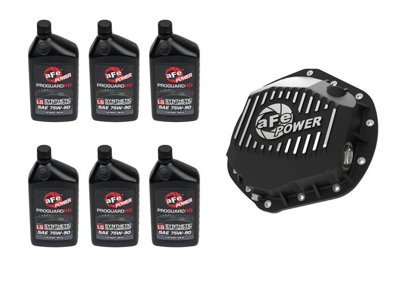 aFe Power’s Pro Series front and rear differential covers bring performance-driven protection to your drivetrain. Constructed from durable cast aluminum and designed with reinforced ribs, these covers offer enhanced strength and improved heat dissipation for demanding driving conditions. This is a complete, ready-to-install kit that includes a rear differential cover, all necessary hardware, and 6 quarts of 75W-90 premium PROGUARD Synthetic gear oil —everything you need for a full service in one convenient package. The supplied gear oil exceeds the performance requirements of API GL-5 recommended for both open and limited slip applications. These covers have an increased oil capacity over stock for better performance over a longer duration. Built-in internal and external fins transfer heat from the oil to the outside air for maximum cooling. This system incorporates magnetic drain and deep reach fill plugs to capture loose particles for maximum protection. Each cover uses a calibration plug set to the factory oil level to eliminate overfilling. Each cover includes an oil level sight glass that allows for quick and easy oil inspection.