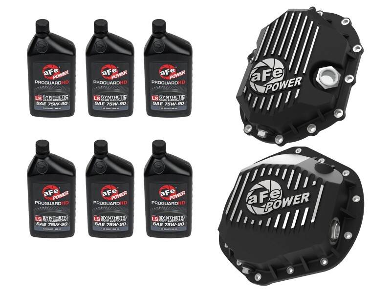 aFe Power’s Pro Series front and rear differential covers bring performance-driven protection to your drivetrain. Constructed from durable cast aluminum and designed with reinforced ribs, these covers offer enhanced strength and improved heat dissipation for demanding driving conditions. This is a complete, ready-to-install kit that includes front and rear differential covers, all necessary hardware, and 6 quarts of 75W-90 premium PROGUARD Synthetic gear oil —everything you need for a full service in one convenient package. The supplied gear oil exceeds the performance requirements of API GL-5 recommended for both open and limited slip applications. These covers have an increased oil capacity over stock for better performance over a longer duration. Built-in internal and external fins transfer heat from the oil to the outside air for maximum cooling. This system incorporates magnetic drain and deep reach fill plugs to capture loose particles for maximum protection. Each cover uses a calibration plug set to the factory oil level to eliminate overfilling. Each cover includes an oil level sight glass that allows for quick and easy oil inspection.
