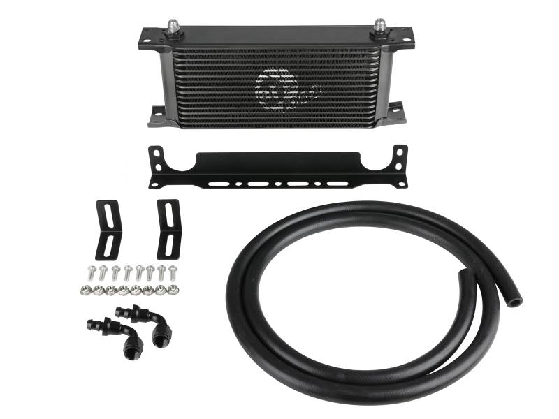 This BladeRunner Oil Cooler uses a durable brazed all-aluminum stacked-plate construction that allows for greater efficiency and lower pressure drop than a standard tube-fin design. The included hoses are heavy-duty, high-temperature, and high-pressure rated. This kit is suitable for use with engine oil, transmission oil, power steering fluid, and more. This BladeRunner Oil Cooler makes installation simple with aluminum universal mounting brackets, stainless steel hardware, and leak-proof AN connections. BladeRunner Oil Coolers feature a durable black powder coated finish with a laser-etched aFe POWER logo on the front and include black-anodized billet aluminum AN fittings for a sleek appearance.