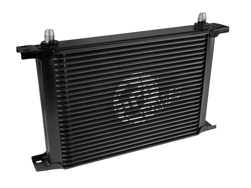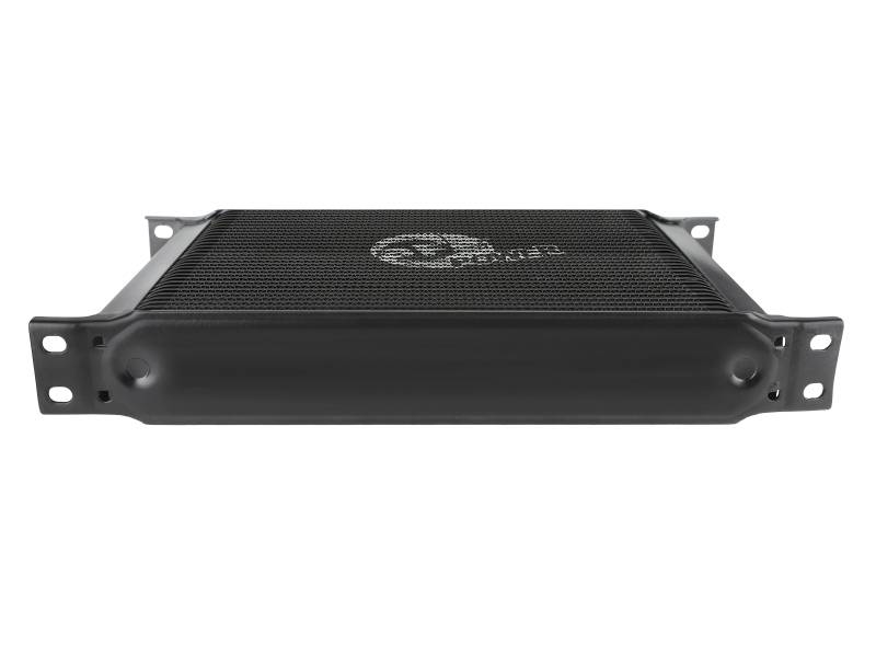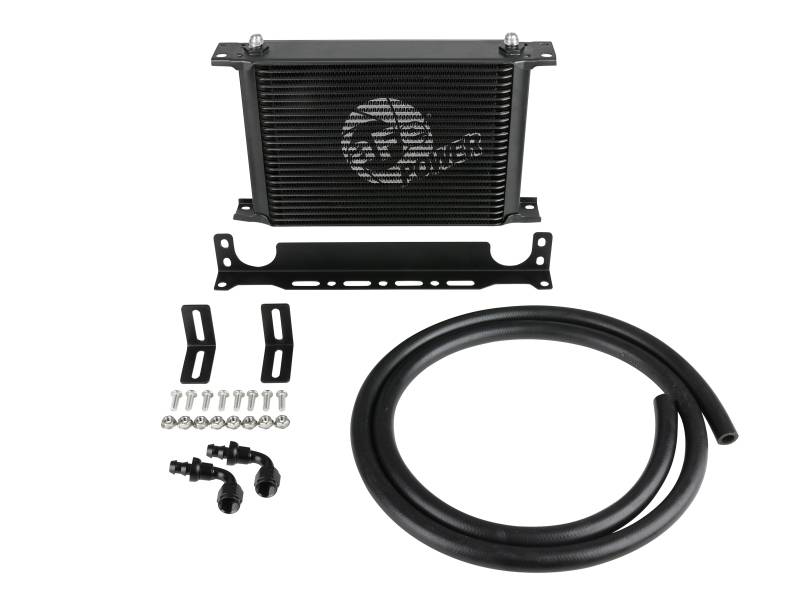 This BladeRunner Oil Cooler uses a durable brazed all-aluminum stacked-plate construction that allows for greater efficiency and lower pressure drop than a standard tube-fin design. The included hoses are heavy-duty, high-temperature, and high-pressure rated. This kit is suitable for use with engine oil, transmission oil, power steering fluid, and more. This BladeRunner Oil Cooler makes installation simple with aluminum universal mounting brackets, stainless steel hardware, and leak-proof AN connections. BladeRunner Oil Coolers feature a durable black powder coated finish with a laser-etched aFe POWER logo on the front and include black-anodized billet aluminum AN fittings for a sleek appearance.
