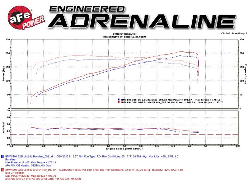 aFe POWER Twisted Steel Long Tube Headers are constructed of near equal length 1-1/2 IN 16-gauge 304 stainless steel tubing with thick flanges to ensure a leak free seal. To eliminate dead space that can cause turbulence and hinder flow that formed collectors are prone to produce, true merge collectors and optimized tube lengths are used for true pulse control technology improving flow and performance. 100% TIG-welded, the smooth curves and increased diameter of this header helps remove restriction and keeps exhaust gas flowing smoothly for improved performance and durability. It uses dual, high flow, 300 CPSI metallic catalytic converters for maximum flow providing an astonishing low end torque improvement. All components are supplied for a hassle-free installation with no modifications necessary. 100% TIG-welded by certified craftsmen for race proven strength and durability. TIG-welding provides the strongest welds reducing stress cracks. The ceramic 300 CPSI metallic catalyst is designed for maximum surface area and flow. aFe has designed this system to retain all your factory sensors for a hassle free installation. Also included are 6 O-ring header flange gaskets. Mitered collectors not only extend the tube lengths and decrease turbulence, but provide optimal exhaust scavenging. The result is increased horsepower, torque and improved throttle response. These headers are constructed of durable CNC mandrel bent brushed 304 stainless steel tubing for maximum performance, corrosion resistance and strength eliminating cracking.