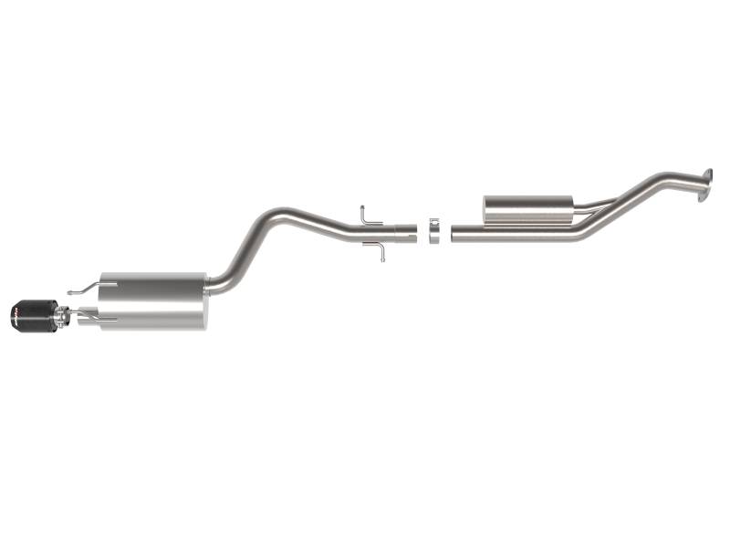 This cat-back exhaust system is constructed of 2-1/2 IN mandrel-bent 304 stainless steel tubing for maximum strength and durability. This system features a high-flow 304 stainless steel polished muffler, producing a deep sound. The muffler has a polished finish for ultimate corrosion resistance. Finishing off this exhaust system is a 4-1/2 IN diameter carbon fiber 304 stainless steel clamp-on exhaust tip. The tip features an aFe POWER logo for a unique style. This system produces a deep sound unleashing all available horsepower and torque. Utilizing a factory style flange and hangers this system is a direct bolt-on system, which requires no cutting or modifications for a hassle-free installation. State-of-the-art computer-aided design technology is utilized for precise vehicle fitment. 100% MIG-Welded for race-proven strength and durability.