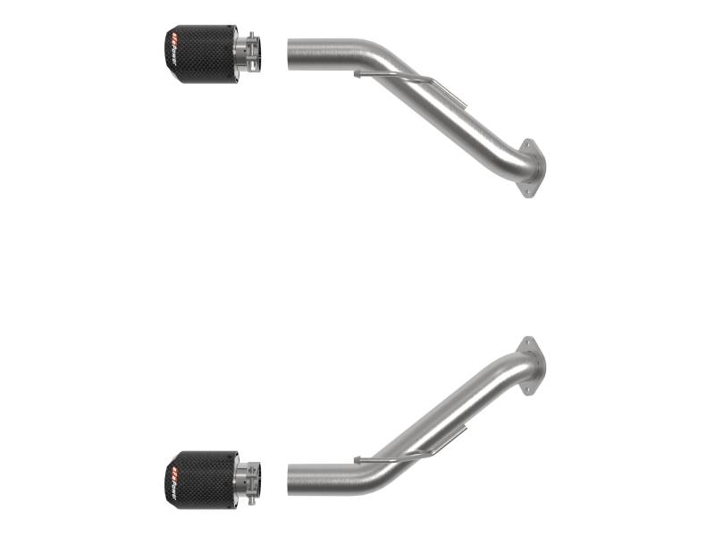 This axle-back exhaust system is constructed of 2-1/2 IN mandrel-bent brushed finished 304 stainless steel tubing for maximum strength and durability. Finishing off this exhaust system are dual 4-1/2 IN diameter carbon fiber stainless steel clamp-on exhaust tips. The tips features an aFe POWER logo for a unique style. This system produces an aggressive sound unleashing all available horsepower and torque. Utilizing factory style flanges and hangers this system is a direct bolt-on system, which requires no cutting or modifications for a hassle-free installation. State-of-the-art computer-aided design technology is utilized for precise vehicle fitment. 100% TIG-Welded for race-proven strength and durability.