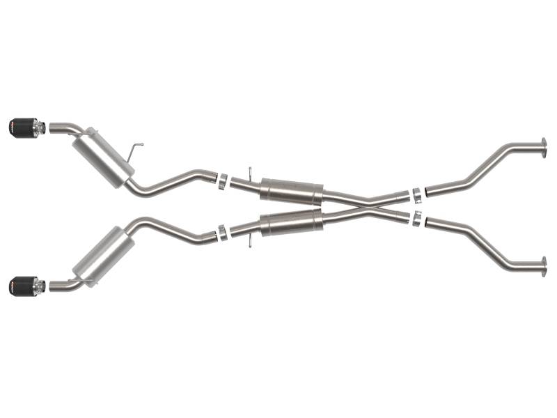 This cat-back exhaust system is constructed of 2-1/2 IN mandrel-bent brushed finished 304 stainless steel tubing for maximum strength and durability. This system features high-flow 304 stainless steel mufflers, producing a deep sound. The mufflers has a polished finish for ultimate corrosion resistance. Finishing off this exhaust system are dual 4-1/2 IN diameter carbon fiber 304 stainless steel clamp-on exhaust tips. The tips features an aFe POWER logo for a unique style. This system produces a deep sound unleashing all available horsepower and torque. Utilizing factory style flanges and hangers this system is a direct bolt-on system, which requires no cutting or modifications for a hassle-free installation. A mitered merge x-pipe is used to balance and evenly distribute exhaust pulses traveling through the exhaust system, minimizing exhaust drone and maximizing scavenging. State-of-the-art computer-aided design technology is utilized for precise vehicle fitment. 100% TIG-Welded for race-proven strength and durability.