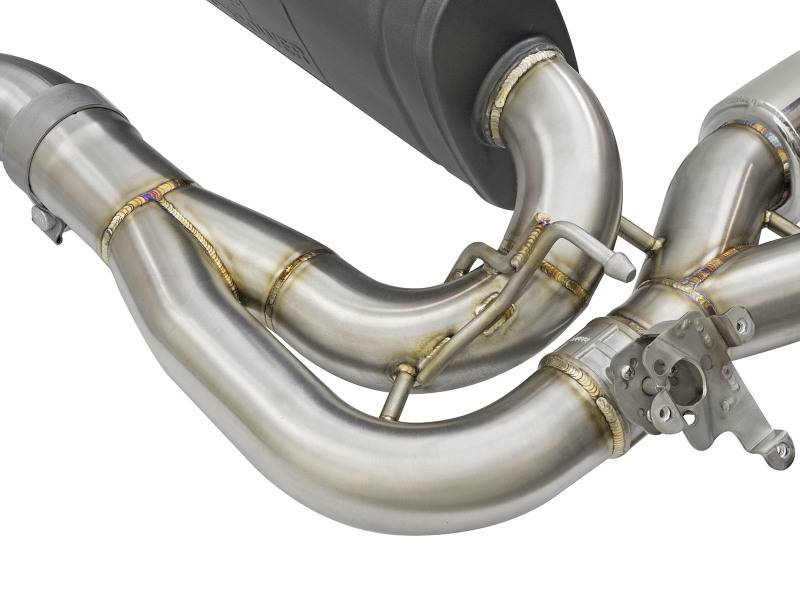 This cat-back exhaust system is constructed of 3 IN - 2-1/2 IN mandrel-bent 304 stainless steel tubing for maximum strength and durability. This system features a high-flow stainless steel high-temperature metallic black muffler, producing a aggressive sound. The muffler has a high-temperature metallic black finish for ultimate corrosion resistance. Finishing off this exhaust system are quad 4 IN diameter polished 304 stainless steel exhaust tips. The tips features a laser etched aFe POWER logo for a unique style. This system produces an aggressive sound unleashing all available horsepower and torque. Utilizing a factory style flange and hangers this system is a direct bolt-on system, which requires no cutting or modifications for a hassle-free installation. This system incorporates a factory style exhaust valve which use the factory exhaust valve motor (not included). The valve helps regulate, direct and control the flow of exhaust gases by opening, closing, or partially obstructing passageways depending on throttle position for maximum performance. A mitered merge collector is used to decrease turbulence and increase exhaust velocity resulting in increased horsepower, torque and improved throttle response. 100% TIG-Welded for race-proven strength and durability.