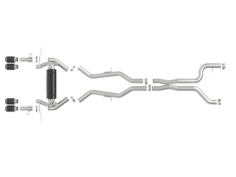 This cat-back exhaust system is constructed of 3 IN - 2-1/2 IN mandrel-bent brushed finished 304 stainless steel tubing for maximum strength and durability. This system features a high-flow stainless steel high-temperature metallic black muffler, producing a powerful sound. The muffler has a high-temperature metallic black finish for ultimate corrosion resistance. Finishing off this exhaust system are quad 4 IN diameter carbon fiber stainless steel clamp-on exhaust tips. The tips features an aFe POWER logo for a unique style. This system produces a powerful sound unleashing all available horsepower and torque. Some cutting may be required, see instruction sheet for further information. Utilizing factory style hangers this system mounts directly to factory mounting locations for a hassle-free installation. A mitered merge x-pipe is used to balance and evenly distribute exhaust pulses traveling through the exhaust system, minimizing exhaust drone and maximizing scavenging. This system incorporates factory style exhaust valves which use the factory exhaust valve motors (not included). The valves help regulate, direct and control the flow of exhaust gases by opening, closing, or partially obstructing passageways depending on throttle position for maximum performance. State-of-the-art computer-aided design technology is utilized for precise vehicle fitment. 100% TIG-Welded for race-proven strength and durability.