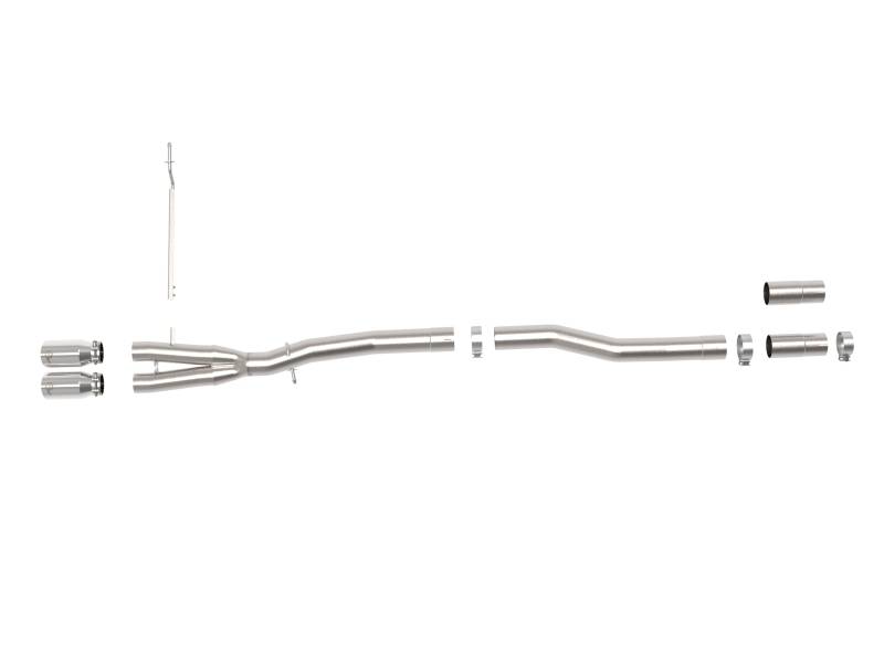 This cat-back exhaust system is constructed of 3 IN - 2-1/2 IN mandrel-bent 304 stainless steel tubing for maximum strength and durability. This system features a 304 stainless steel muffler, producing a aggressive sound. Finishing off this exhaust system are dual 3-1/2 IN diameter 304 stainless steel clamp-on exhaust tips. The tips features a laser etched aFe POWER logo for a unique style. This system produces an aggressive sound unleashing all available horsepower and torque. Utilizing factory style this system is a direct bolt-on system, which requires no cutting or modifications for a hassle-free installation. This cat-back exhaust system uses a heavy duty flex pipe with an internal interlock liner for added strength and durability. State-of-the-art computer-aided design technology is utilized for precise vehicle fitment. 100% MIG-Welded for race-proven strength and durability.