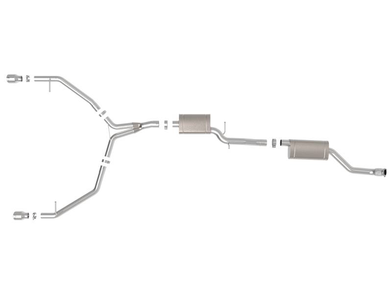 This cat-back exhaust system is constructed of 3 IN to 2-1/2 IN mandrel-bent 304 stainless steel tubing for maximum strength and durability. This system features high-flow stainless steel mufflers, producing a mild sound. Finishing off this exhaust system are dual 4 IN diameter polished 304 stainless steel clamp-on exhaust tips. The tips features a laser etched aFe POWER logo for a unique style. This system produces a mild sound unleashing all available horsepower and torque. Utilizing a factory style flange and hangers this system is a direct bolt-on system, which requires no cutting or modifications for a hassle-free installation. This cat-back exhaust system uses a heavy duty flex pipe with an internal interlock liner for added strength and durability. Utilizing state-of-the-art computer-aided design technology, this exhaust system is designed for custom, high tolerance factory fitment. 100% MIG-Welded for race-proven strength and durability.