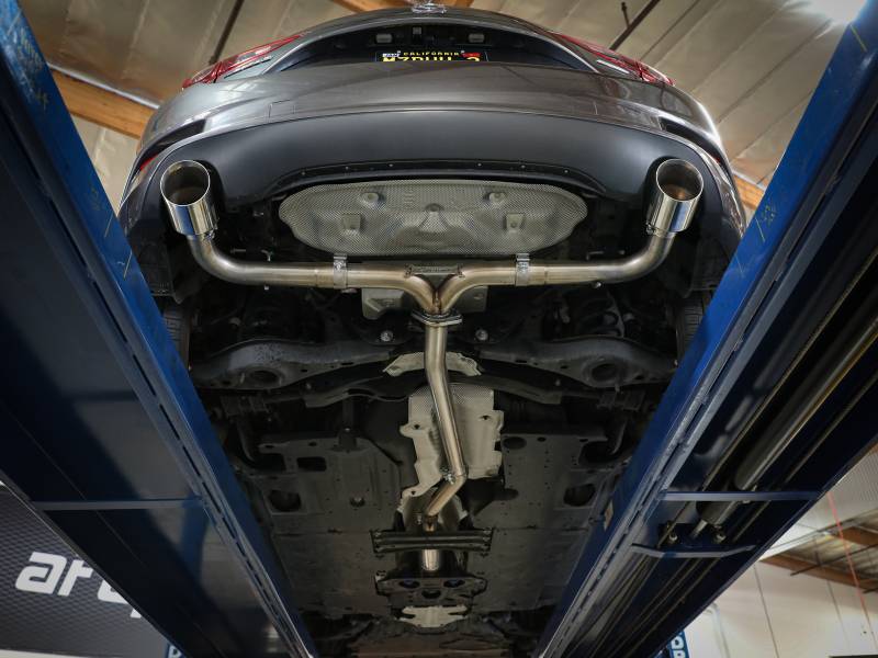 This system produced gains of up to +5 HP and +7 lbs. x Ft. TQ., as measured on our in-house dyno. This cat-back exhaust system is constructed of 2-1/2" mandrel-bent 304 stainless steel tubing for maximum strength and durability. This system features a high-flow 304 stainless steel muffler, producing a throaty sound. Finishing off this exhaust system are dual 4-1/2" diameter carbon fiber 304 stainless steel clamp-on exhaust tips. The tips features an aFe POWER logo for a unique style. This system produces a throaty sound unleashing all available horsepower and torque. Some cutting will be required, see instruction sheet for further information. Utilizing factory style flanges and hangers this system mounts directly to factory mounting locations for a hassle-free installation. A mitered merge collector is used to decrease turbulence and increase exhaust velocity resulting in increased horsepower, torque and improved throttle response. Utilizing state-of-the-art computer-aided design technology, this exhaust system is designed for custom, high tolerance factory fitment. 100% MIG-Welded for race-proven strength and durability.