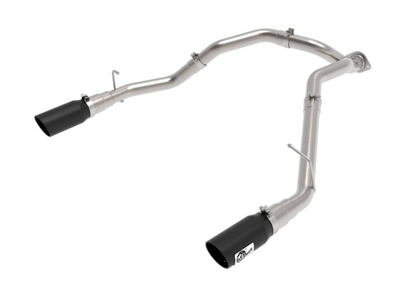 This DPF-back exhaust system is constd of 3" mandrel-bent 409 stainless steel tubing for maximum strength and durability. Finishing off this exhaust system are dual 5" diameter black 304 stainless steel clamp-on exhaust tips. The tips features an aFe POWER logo plate riveted on for a unique style. Utilizing a factory style flange and hangers this system is a direct bolt-on system, which requires no cutting or modifications for a hassle-free installation. Utilizing state-of-the-art computer-aided design technology, this exhaust system is designed for custom, high tolerance factory fitment. 100% MIG-Welded for race-proven strength and durability.