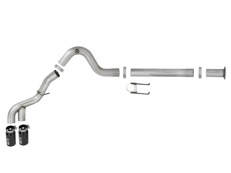 This DPF-back exhaust system is constructed of 4" mandrel-bent 409 stainless steel tubing for maximum strength and durability. Finishing off this exhaust system are dual 5" diameter black 304 stainless steel intercooled clamp-on exhaust tips. The tips features an aFe POWER logo plate riveted on for a unique style. Some cutting may be required, see instruction sheet for further information. Utilizing a factory style flange and hangers this system mounts directly to factory mounting locations for a hassle-free installation. OE-style bayonet hangers are used to maintain a stable pipe location during high vibration and high heat conditions. The bayonet tip holds the hanger bushing in place for an OE-style fit that does not change with time. 100% MIG-Welded for race-proven strength and durability.