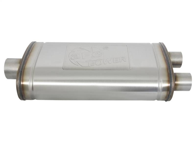 The aFe Universal fit 409 Stainless Steel Performance Muffler is designed to provide a deep, throaty, powerful sound on acceleration but maintain a smooth sound at idle. This muffler is constructed of brushed finished 409 stainless steel and uses a straight through perforated core with heat resistant packing to reduce backpressure and maximize exhaust flow. You will see increased performance and improved throttle response over the factory exhaust. Also featuring a stamped aFe Power logo for an aggressive style.