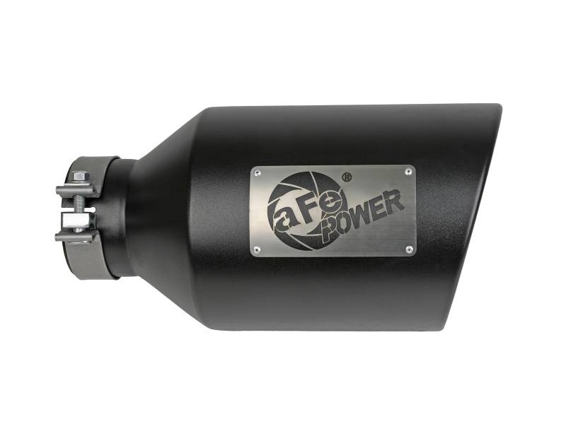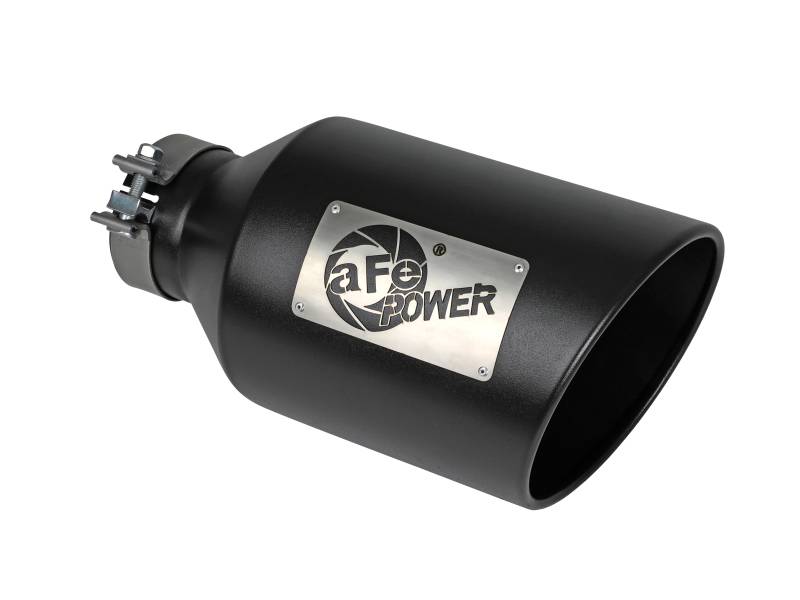 This direct-fit clamp-on tip is constructed from 304 stainless steel and features a black finish for corrosion resistance for long lasting good looks. Designed to fit 4" exhaust systems; 4" inlet x 8" outlet and 15" inch length. This tip features an aFe POWER logo for an aggressive, custom look. A high quality stainless steel clamp is used for a complete 360 degree sealing surface. This product does not require a CARB EO#.