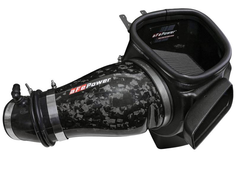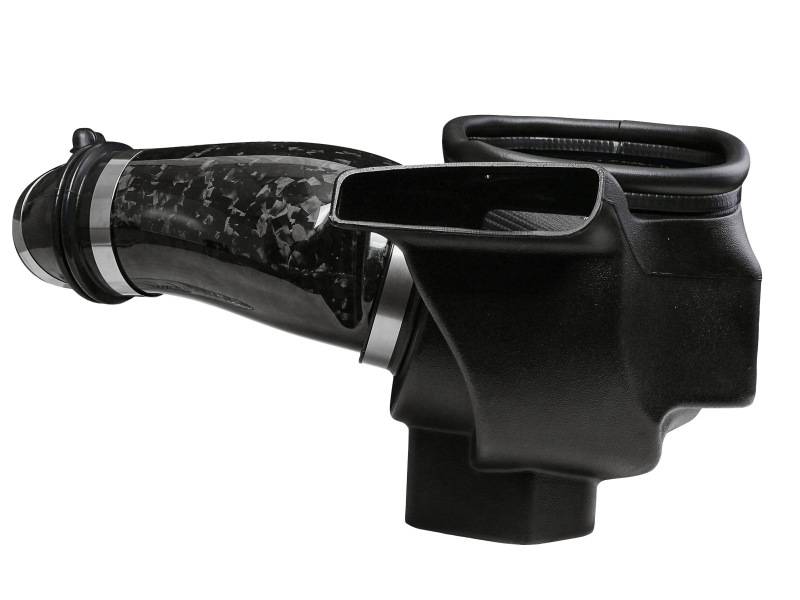 This 7” tall 360-degree radial flow air filter features a 5-1/2" by 7-1/2" flange and our pre-oiled black Pro 5R media with five layers of progressively finer cotton gauze media for maximum performance. It provides your engine with the largest amount of high-flowing air and delivers the highest power gains in most cases, while adding a stealthy look in the engine bay. This media is perfect for street and/or track use. The included massive air filter is surrounded by an open-element XLPE (cross-linked polyethylene) polymer housing that minimizes warm engine air for maximum performance. Its open design allows for easy viewing of the air filter and delivers an aggressive Air Intake sound. Multiple air inlets bring in cool air when under power without capturing any warm air surrounding the engine. The factory MUA (Multi-Air Unit Actuator) is easily transferred to the aFe POWER housing to guarantee correct crankcase flow, avoiding check engine lights and damaging factory hoses and sensors. The lightweight tube is computer-designed to achieve maximum power gains while maintaining a perfect fit. Manufactured from 100% forged carbon fiber, it features zero fiberglass and is clear-coated for the highest quality construction, inspired from the optional forged carbon fiber interior accents. This is a direct fit intake system that utilizes factory mounting points. All necessary stainless-steel clamps, silicone coupling, and hardware are included. Its revolutionary design, featuring our patent pending filter-to-housing interface, uses half the number of parts of a traditional cold air intake system.