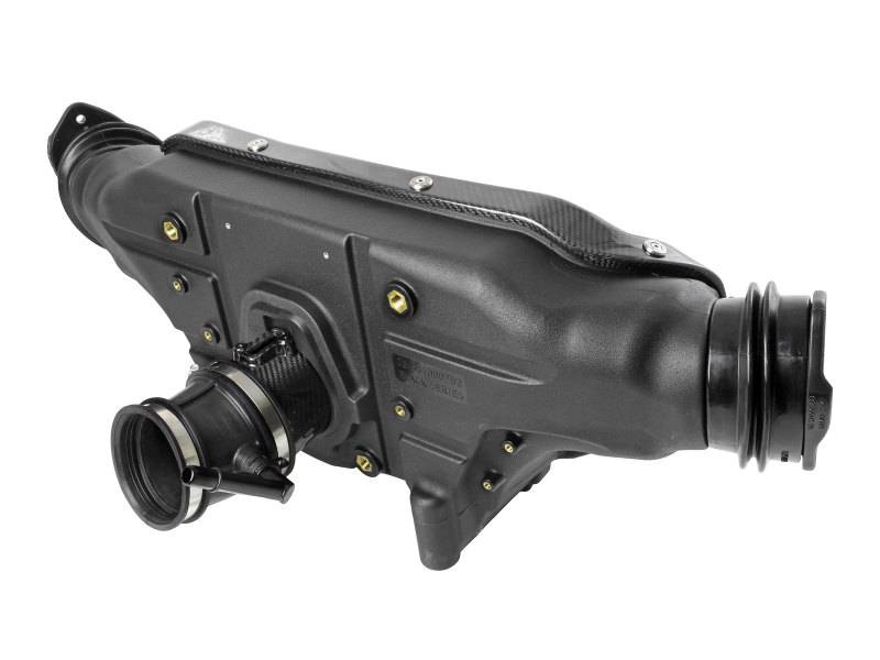 Dual 4” Flange 360-degree radial flow air filters feature our oil-free Pro DRY S media with three layers of synthetic media for maximum convenience. Their progressive layering provides great filtration efficiency and dust holding capacity, while not requiring the use of oils. This media is best suited for street use. Their inverted tops make for more filter surface area, resulting in longer service intervals. Lightweight twill weave carbon fiber tube directs the filtered air from the dual air filters to the engine. It is computer designed and dyno tested to increase air flow while reducing weight and enhancing the visual appearance of the engine bay. The tube is manufactured out of 100% carbon fiber material (No fiberglass). The dual air filters are surrounded by an open-element XLPE (cross-linked polyethylene) polymer housing that minimizes warm engine air for maximum performance. It is precisely designed and manufactured to fit perfectly into the factory mounting location. The housing connects to the factory air inlets on each side of the vehicle to capture the coolest air available. Silicone bellow couplings are used for engine movement and easy installation. This unique carbon fiber cover is also lightweight high gloss clear-coated twill weave carbon fiber and closes off the housing from unwanted hot engine air. It features a Black Series emblem for authenticity and is secured to the housing using aFe POWER laser etched washers and bolts. This cover will greatly enhance your engine bay appearance. Premium stainless steel clamps and flexible silicone couplings are used for strength and durability while also providing the most secure installation available.