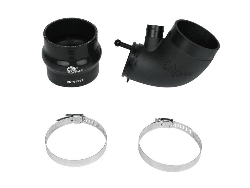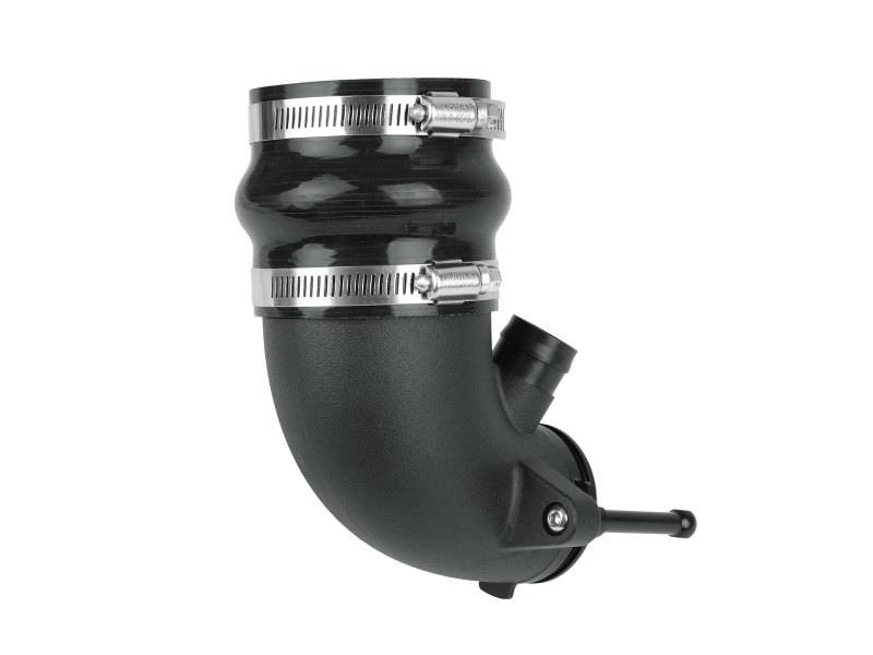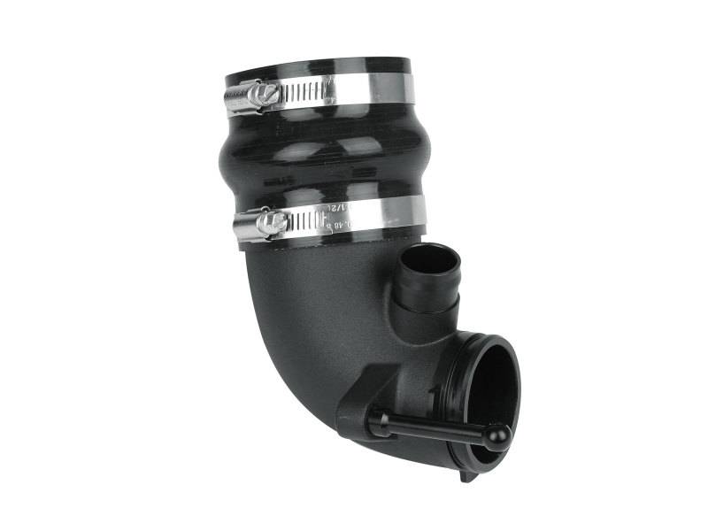 This turbo inlet is the perfect addition to your aFe air intake system. It removes restriction of the factory turbo inlet and guarantees increased air flow for maximum power. It provides a smooth transition for the air from the aFe air intake tube to the turbo with minimum restriction. The cast aluminum design has CNC machined ends for a perfect fit and finish. The part is anodized black for durability and a stealthy appearance. This turbo inlet utilizes a flexible silicone coupling that is reinforced with two layers of polyester material, making it resistant to wear and deterioration. The silicone coupling mates directly to the aluminum turbo adapter and the aFe air intake tube. All necessary clamps are provided. This turbo inlet utilizes the factory O-Ring and screw and comes with the necessary clamps and coupler to fit perfectly with your aFe air intake system.