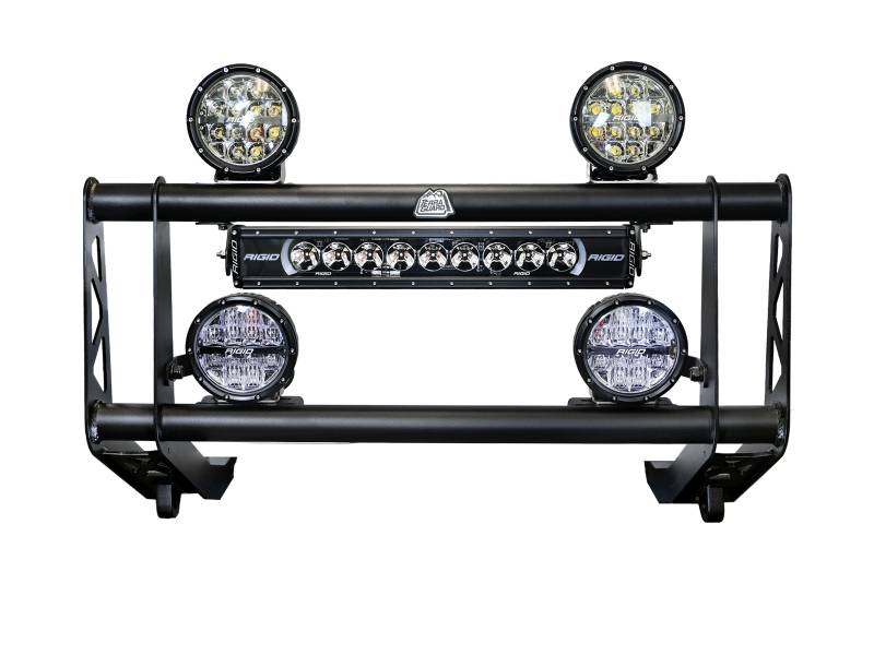 Constructed from rugged 3/16” and 1/4” steel plate and 2” diameter steel tubing, Terra Guard’s bull bar is built to withstand the toughest conditions. Integrated recovery shackle mounts offer convenient, secure recovery solutions. Light tabs support up to four 6-inch diameter lights and a 20” light bar. Finished in a fine-textured black powder coat, it delivers a clean look with exceptional durability—all with no-drill, direct bolt-on installation. By popular demand, we’ve combined our Bull Bar with RIGID 6” Drive & Spot RGBW light pods and a 20” Radiance RGBW light bar to offer you an easy, all-in-one lighting solution. Built from robust 3/16” and 1/4” steel plate and 2” diameter steel tubing, providing unmatched strength and durability. Features integrated recovery shackle mounts, allowing you to easily connect 3/4" shackles for quick and secure recoveries (shackles not included). Coated in a fine-textured black powder for a rugged, finished look that stands up to the elements. Kit includes RIGID 6” Drive (RIGID P/N: 36411) & Spot (RIGID P/N: 36412) light pods plus a 20” Radiance light bar (RIGID P/N: 220053) all equipped with RGBW 7-Color backlighting.
