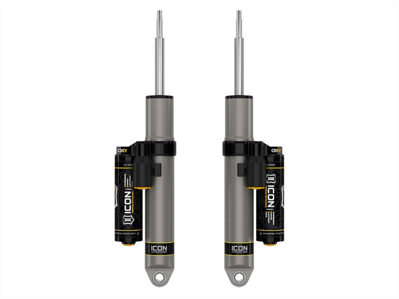 ICON Vehicle Specific (V.S.) 2.5 Aluminum Series shocks with CDEV are designed and built to give your vehicle outstanding performance off-road and a smooth ride on the street. These shocks are configured specifically for each application in both length and damping tune. For piggyback and specific remote reservoir applications, ICON'S unique use of a 6061-billet aluminum manifold a few inches below the top cap of the shock creates an internal Bump Zone that when used creates an additional 20% of damping force. This additional force helps prevent harsh bottom outs and controls the suspension when compressing at high velocity. Like all ICON'S Shock Absorbers, V.S. 2.5 Aluminum Series shocks with CDEV are fully rebuildable and re-tunable. The ICON CDE Valve upgrade is included for those desiring an easy way to tune the ride electronically from inside the vehicle.