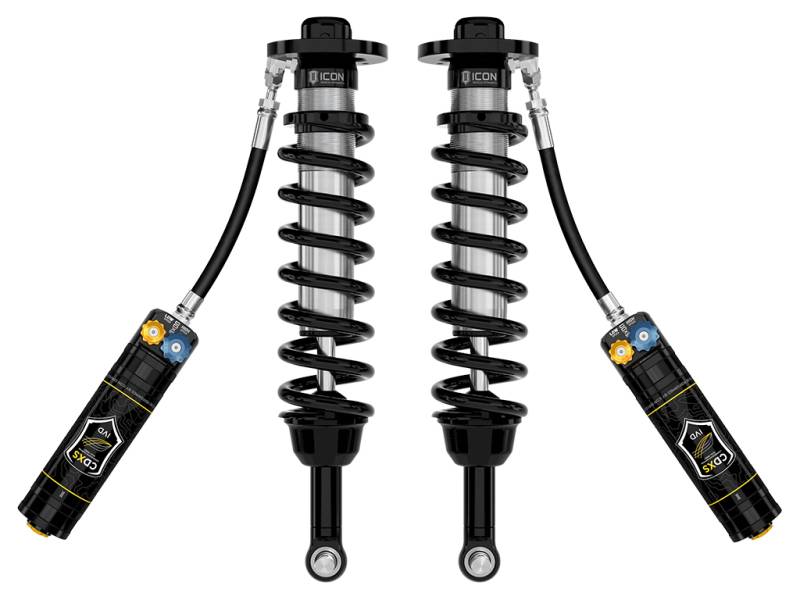 ICON Vehicle Dynamics V.S. 2.5 Series remote reservoir front coilover shocks are an incredible upgrade for the front end of the 2022-2025 Toyota Tundra or 2023-2025 Toyota Sequoia. These adjustable coilovers allow up to 1.25-3.5” of lift height adjustability on Tundra or 3.5-4.5" of front lift on Sequoia, allowing the use of larger, more aggressive wheel and tire combinations. ICON’s Vehicle-specific shock length and valving along with the larger 2.5” shock body and increased piston area over stock components yield the maximum travel possible along with superior ride quality and suspension performance both on- and off-road. remote reservoirs greatly increase shock oil volume and heat dissipation surface area to resist overheating and cavitation under hard use, which can lead to damper fade. ICON's exclusive Compression Damping Dual Speed (CDXS) valves are included for precisely dialing in your suspension performance. CDXS controls fluid flow under compression, with independent adjustability of high speed and low speed compression force. 10 discreet detented settings for both low and high-speed adjustment knobs allow separate adjustments for handling response and overall aggressiveness. When paired with ICON 2.0 or 2.5 Aluminum Series rear coilovers vehicle control will be balanced front to rear, resulting in the best overall driving experience for your Toyota Tundra or Sequoia.