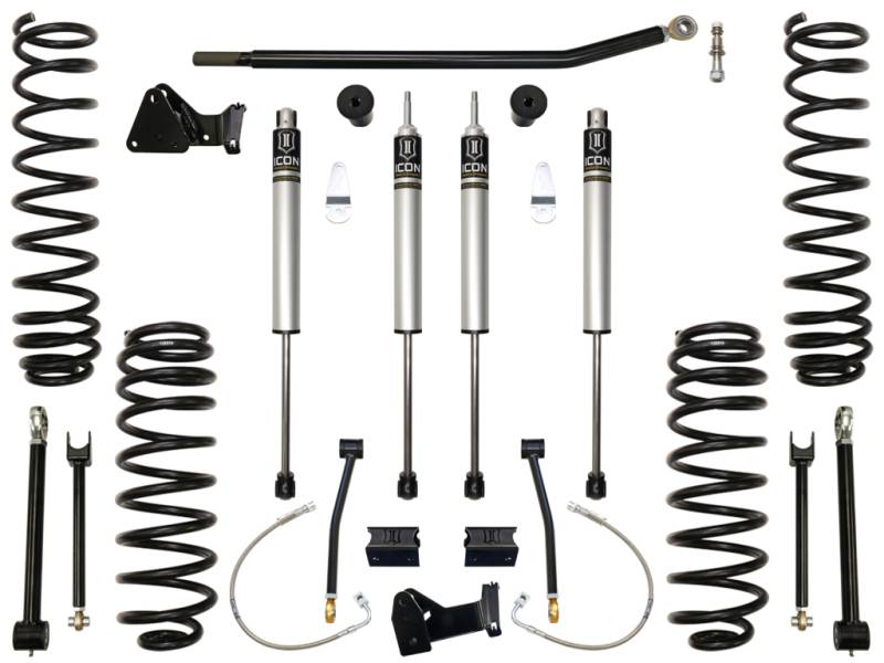 The ICON Stage 1 Jeep JK 4.5" suspension system includes dual-rate coil springs, track bar drop brackets, high-steering components, bumpstop spacers, rear brake lines, rear sway bar links, adjustable front upper and rear lower links, and 2.0 Aluminum Series IFP shocks. Tested and tuned, the ICON JK Stage 1 suspension system offers stability and drivability over a wide range of off road terrains, while keeping a smooth onroad feel for every day driving. Installing this kit allows proper clearance for 35" tall tires with no modifications and 37" tires with aftermarket high clearance fenders.