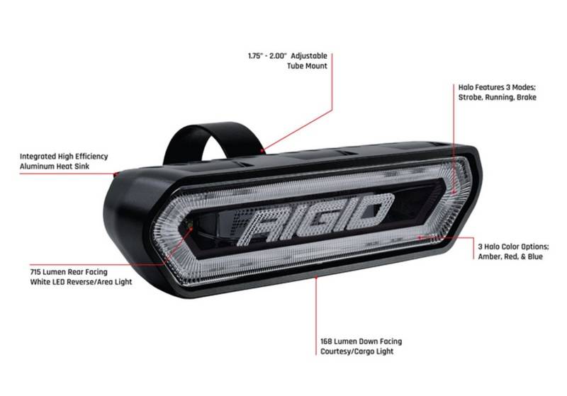 The RIGID Chase rear facing LED light adds safety and functionality to any UTV, rail, buggy, Jeep, or other off-road application by packing reverse, courtesy, strobe, running, and brake lights into a single compact light. A halo of powerful LEDs in red, amber, or blue around the perimeter of the aluminum housing can be used as a strobe for racing and chase applications, running light, or third brake light. The center portion of the RIGID Chase functions as a 715 lumen white light suitable for use as a Reverse or area light, and there's also a smaller downward-facing courtesy light for illuminating the cargo area. Whether it's used individually or wired in series, the RIGID Chase LED light is packed with features at a great value. Own The Night with RIGIDs rear facing Chase LED light.